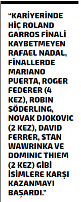 Son üç yılda toparlanan ve turnuvadaki hâkimiyeti tekrar eline alan yıldız isim, toplamdaki şampiyonluk sayısını da, bu yılki şampiyonluğuyla birlikte 12’ye çıkardı. Roland Garros’ta bugüne kadar toplamda 95 maça çıkan İspanyol sporcu, 93 galibiyet ve sadece iki mağlubiyetle yüzde 98 gibi müthiş bir galibiyet yüzdesine de imza atmış durumda.
