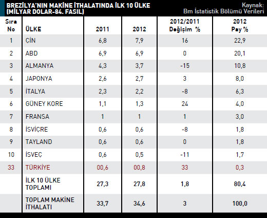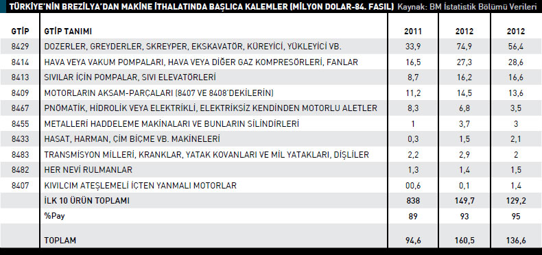makine ihraç ederken bu rakam 2012 yılında 89,6 milyon dolar oldu. Brezilya 84. Fasılda 2012 yılı itibarıyla en fazla bilgisayar ve büro makinele - rinin aksam-parçaları ürün grubunda ithalat gerçekleştirdi. Bir önceki yıla göre yüzde 34,9 artışla, söz konusu ürün grubunda gerçekleştirilen ithalatın değeri 2,4 milyar dolar olarak kaydedildi. İkinci sırada bulunan turbojetler, turbopropeller, diğer gaz türbinleri kaleminde Brezilya, 2012 yılında 2,1 milyar dolarlık ürün ithal etti. Üçüncü sıradaki otomatik bilgi işlem makineleri ve bunlara ait birimler ürün grubunda, 2011 yılında 2,2 milyar dolarlık ithalat gerçekleştirilirken bu rakam 2012 yılında yüzde 3,2 azalarak 2,1 milyar dolar oldu. Matbaa, baskı, faks ve kopyalama makineleri ürün grubu ithalat listesinin dördüncü sırasında yer alırken beşinci ise motorların aksam-parçaları (8407 ve 8408’dekilerin) bulunuyor. Bilgisayar ve büro makinelerinin aksam-parçaları, Brezilya’nın 2012 yılında en fazla ithal ettiği mal grubu oldu.TÜRKİYE’NİN MAKİNE İHRACATI ARTIYOR