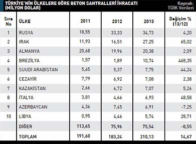 Türkiye’nin beton santralleri ihracatı 2013 yılında, bir önceki yıla oranla yüzde 14,6 artarak 210 milyon dolara çıktı. 2012 yılında bu rakam 183 milyon dolar düzeyindeydi. Türkiye 2013 yılında beton santralleri sektöründe en fazla Rusya’ya ihracat gerçekleştirdi. 2012 yılında söz konusu ülkeye 33,3 milyon dolarlık ihracat gerçekleştirilirken bu rakam, 2013 yılında yüzde 4,20 artışla 34,7 milyon dolar seviyesine yükseldi. Listenin ikinci sırasında ise Irak bulunuyor. Türkiye’nin Irak’a yönelik beton santralleri ihracatı 2013 yılında 27,2 milyon dolar oldu. 2012 yılında bu rakam 16,5 milyon dolardı. Irak’a yönelik ihracat artışı yüzde 65 olarak kayda geçti. Üçüncü sırada bulunan Almanya’ya 2012 yılında 19,9 milyon dolar değerinde beton santrali ihraç edilirken bu rakam 2013 yılında yüzde 2 artarak 20,3 milyon dolara yükseldi. Türkiye’nin 2013 yılında beton santralleri ihracatını en fazla artırdığı ülke yüzde 468,3 ile Brezilya oldu. Brezilya’ya 2012 yılında 1,89 milyon dolar değerinde beton santrali ihraç edilirken bu rakam, 2013 yılında 10,7 milyon dolar seviyesine yükseldi. Türkiye 2013 yılında beton/harç karıştırıcılar ve toprak, taş, cevher ayıran, yıkayan makinelerin parçaları kaleminde ihracat gerçekleştirdi. 2012 yılında beton/harç karıştırıcıları kaleminde 68,9 milyon dolarlık ihracat gerçekleştirilirken bu rakam, 2013 yılında yüzde 24 artışla 85,6 milyon dolar seviyesine yükseldi. Toprak, taş, cevher ayıran, yıkayan makinelerin parçaları ürün grubunda 2013 yılında gerçekleştirilen ihracatın değeri 124,5 milyon dolar olarak kaydedildi. 2012 yılında bu rakam 114,26 milyon dolardı. Bahsedilen ürün grubunda yaşanan ihracat artışı yüzde 8,97 oldu. Türkiye’nin beton santralleri ithalatı 2012 yılında 76 milyon dolarken bu rakam, 2013 yılında yüzde 11,2 azalarak 67,6 milyon dolar seviyesine geriledi. Türkiye 2013 yılında 27,04 milyon dolarla en fazla Almanya’dan beton santrali ithal etti. 2012 yılında söz konusu ülkeden gerçekleştirilen ithal