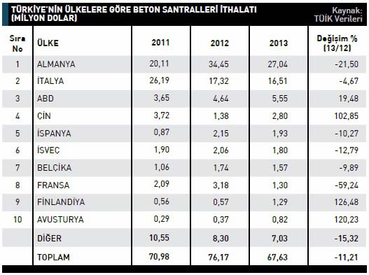 atın değeri 34,4 milyon dolardı. Türkiye’nin 2013 yılında Almanya’dan gerçekleştirdiği ithalat yüzde 21,5 olarak kaydedildi. Listenin ikinci sırasında bulunan İtalya’dan 2012 yılında 17,3 milyon dolarlık beton santrali ithal edilirken bu rakam, 2013 yılında yüzde 4,6 azalarak 16,5 milyon dolara geriledi. Üçüncü sırada bulunan ABD’den 2013 yılında 5,5 milyon dolar değerinde beton santrali ithal edildi. 2012 yılında Türkiye’nin söz konusu ülkeden gerçekleştirdiği beton santrali ithalatı 4,64 milyon dolardı. ABD’den gerçekleştirilen ithalattaki artış 19,4 oldu. Türkiye’nin 2013 yılında beton santralleri ithalatını en fazla artırdığı ülke yüzde 126,4 ile Finlandiya oldu. Finlandiya’dan 2012 yılında 0,57 milyon dolarlık beton santrali ithal edilirken bu rakam 2013 yılında 1,29 milyon dolar seviyesine yükseldi. Türkiye 2013 yılında beton/ harç karıştırıcılar ve toprak, taş, cevher ayıran, yıkayan makinelerin parçaları kaleminde ithalat gerçekleştirdi. Söz konusu ürün kaleminde 2012 yılında 60,9 milyon dolarlık ithalat gerçekleştirilirken bu rakam 2013 yılında, yüzde 14,56 azalarak 52 milyon dolar olarak kaydedildi. Söz konusu ürün grubunda gerçekleşen ithalat artışı 2012 yılında 49,6 olarak kaydedildi. Beton/harç karıştırıcılar ürün grubunda 2013 yılında gerçekleştirilen ithalat 15,5 milyon dolar oldu. 2012 yılında bu ra