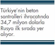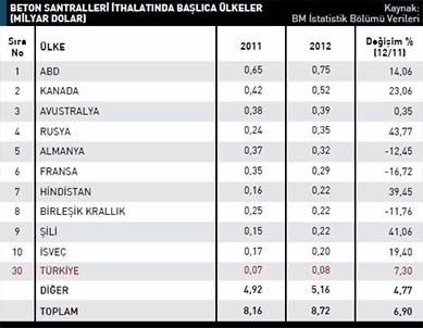 sırasında yer aldı. 2011 yılında 70 milyon dolar değerinde beton santrali ithal eden Türkiye, 2012 yılında yüzde 7,3 artışla 80 milyon dolara yakın ithalat gerçekleştirdi. En fazla beton santrali ithal eden ilk 10 ülke listesinde, 2011 yılına göre ithalatını en fazla artıran ülke ise yüzde 43,7 ile Rusya oldu. Rusya 2011 yılında 240 milyon dolarlık beton santrali ithal ederken bu rakam 2012 yılında 350 milyon dolar seviyesine yükseldi.