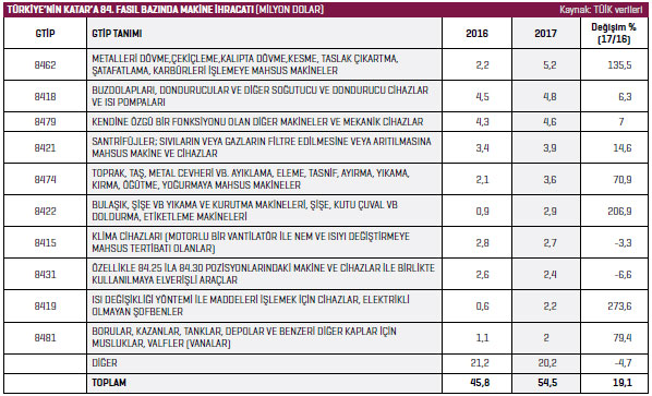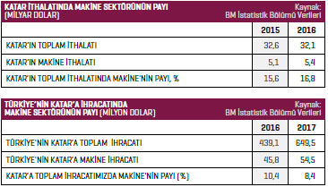 TÜİK verilerine göre; 2016 yılında Katar’a 439,1 milyon dolarlık ihracat gerçekleştiren Türkiye, 2017 yılına gelindiğinde söz konusu rakamı 649,5 milyon dolara çıkarmayı başardı. Söz konusu ihracat rakamından makine sektörünün aldığı pay ise 54 milyon dolarla yüzde 8,4 oldu. 84. fasıl itibarıyla Türkiye’nin Katar’a 2017 yılında makine ihracatı 2016 yılına göre yüzde 19,1 artış göstermiş oldu. Türkiye’nin Katar’a makine ihracatında en fazla yer tutan mal grubu 5,2 milyon dolarla 8462 GTİP kodlu “Metalleri dövme, çekiçleme, kalıpta dövme, kesme, taslak çıkartma, şatafatlama, karbürleri işlemeye mahsus makineler” oldu.