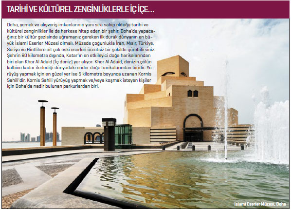 Gezecek ve keşfedecek çok yer var şehirde. Yılda bir düzenlenen ve daima popülerliğini koruyan açık hava gurme ziyafeti olan “Katar Uluslararası Yemek Festivali” mutlaka görülmesi gereken festivallerden bir tanesi. Doha’nın mutfağı şaşırtıcı derecede zengin ve çeşitli. Toprak kapta sunulan efsane lezzet fahsa, pilav ve kuruyemiş yatağında servis edilen kuzu rostodan yapılmış ghuzi, yoğurtla servis edilen deniz mahsullü veya etli bol baharatlı pirinç pilavı ve koyun etinden oluşan machboos denemeden dönülmemesi gereken lezzetlerden sadece birkaçı.