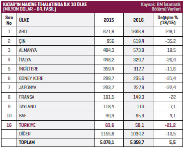 Katar’ın başlıca makine tedarikçileri 2016 yılında 1666,8 milyon dolarla ABD, 619,4 milyon dolarla Çin ve 573,9 milyon dolarla Almanya şeklinde sıralanırken, Türkiye Katar’ın makine ithalatı gerçekleştirdiği ülkeler içerisinde 16’ncı sırada yer aldı. BM İstatistik Bölümü verilerine göre, 2016 yılında Katar Türkiye’den 50,1 milyon dolarlık makine ithal etti. Katar’ın makine ithalatı gerçekleştirdiği 10 ülke arasında yer alan diğer ülkeler ise; İtalya (329,7 milyon dolar), İngiltere (317,7 milyon dolar), Güney Kore (235,6 milyon dolar) Japonya (227,8 milyon dolar), Fransa (149,3 milyon dolar), Tayland (110 milyon dolar) ve BAE (95,3 milyon dolar) olarak sıralandı.