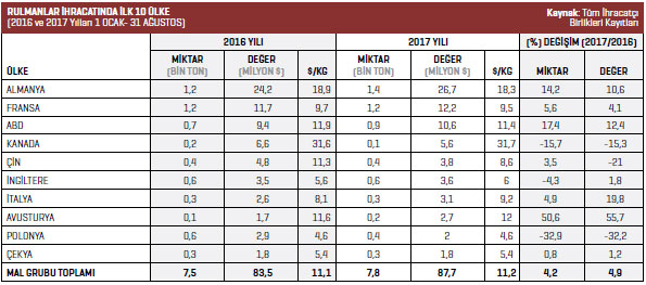 Rulman ihracatı 2016 yılının Ocak-Ağustos döneminde 83,5 milyon dolar olarak kayda geçerken, bu rakam 2017 yılının aynı döneminde yüzde 4,9 artışla 87,7 milyon dolar oldu.