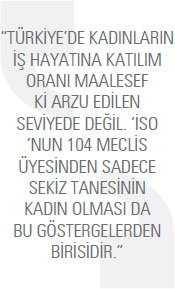 Türkiye’de kadınların iş hayatına katılım oranı maalesef ki arzu edilen seviyede değil. Sanayi alanında da bu oran oldukça düşük ve bu durum araştırma rakamları ile de doğrulanıyor. ’İSO ’nun 104 meclis üyesinden sadece sekiz tanesinin kadın olması da bu göstergelerden birisidir. İSO’nun yönetimindeki kadınlarımızın öncülüğünde İSO Kadın Sanayiciler Platformunun temelleri 8 Mart Dünya Kadınlar Günü vesilesi ile atıldı. Bir kadınlar günü etkinliği ile kalmayıp önemli konulara dikkat çeken manifestomuzda belirttiğimiz üzere de amacımız Türk sanayisinde ve dolayısıyla İSO bünyesinde kadın yönetici sayısını artırmak. Kadın istihdamının artırılması, girişimci kadınların desteklenmesi, kadınların siyasete katılımı, kadın erkek eşitliğinin güvence altına alınması, kadınların okur-yazarlık ve eğitim seviyesi gibi belli başlı konular yayınladığımız manifestoda yer alan başlıklar arasında bulunuyor.