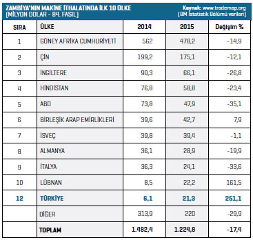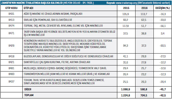 BM İstatistik Bölümü verilerine göre Zambiya’nın makine ithalatı 2015 yılında bir önceki yıla oranla yüzde 17,4 azalarak 1,2 milyar dolar olarak kaydedildi. 2014 yılında bu rakam 1,4 milyar dolar seviyesindeydi. 2015 yılı rakamlarına göre Zambiya’nın en fazla makine ithal ettiği ilk 10 ülke listesinin ilk sırasında Güney Afrika Cumhuriyeti bulunuyor. Söz konusu ülkeden 2014 yılında 562 milyon dolar değerinde makine ithal eden Zambiya’nın, 2015 yılı makine ithalatı yüzde 14,9 azalarak 478,2 milyon dolar olarak kaydedildi. Zambiya, 2015 yılında listenin ikinci sırasında bulunan Çin’den 175,1 milyon dolar değerinde makine ithal etti. 2014 yılında bu rakam 199,2 milyon dolar seviyesindeydi. 2015 yılında Zambiya’nın Çin’den gerçekleştirdiği makine ithalatı yüzde 12,1 azaldı. Zambiya’nın 2015 yılında en fazla makine ithal ettiği ilk 10 ülke listesinin üçüncü sırasında ise İngiltere yer alıyor. Zambiya 2014 yılında İngiltere’den 90,3 milyon dolar değerinde makine ithal ederken bu rakam, 2015 yılında yüzde 26,8 azalarak 66,1 milyon dolar olarak kaydedildi. Zambiya’nın 2015 yılında, ilk 10 ülke arasında bir önceki yıla göre makine ithalatını en fazla artırdığı ülke yüzde 161,5 ile Lübnan oldu. Lübnan’dan 2014 yılında 8,5 milyon dolar değerinde makine ithal edilirken 2015 yılında bu rakam 21,3 milyon dolar seviyesinde kaydedildi. Türkiye, 2015 yılında Zambiya’nın en fazla makine ithal ettiği ülkeler listesinin 12. sırasında bulunuyor. Zambiya 2016 yılında en fazla ağır iş makine ve cihazlarının aksamı, parçaları kaleminde ürün ithal etti. 2015 yılında söz konusu ürün grubunda 135,9 milyon dolarlık ithalat gerçekleştirilirken bu rakam, 2016 yılında yüzde 16,3 azalarak 113,7 milyon dolar olarak kayda geçti. Listenin ikinci sırasında sıvılar için pompalar, sıvı elevatörleri bulunuyor. Zambiya, 2015 yılında söz konusu kalemde 93,2 milyon dolar değerinde makine ithal ederken 2016 yılında bu rakam yüzde 33 azalarak 62,5 milyon dolar oldu. Zambiya’nın en fazla ithalat gerçekleştirdiği üçüncü kalem toprak, taş, metal cevheri vb. ayıklama, eleme vb. için makineler oldu. 2016 yılında söz konusu ürün grubunda 51,7 milyon dolarlık ithalat gerçekleştirildi. 2015 yılında söz konusu mal grubunda gerçekleştirilen ithalatın değeri 117,8 milyon dolardı. Toprak, taş, metal cevheri vb. ayıklama, eleme vb. için makineler kalemindeki ithalat yüzde 56,1 azaldı.