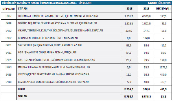 TÜİK verilerine göre Türkiye’nin 84. fasılda Zambiya’ya gerçekleştirdiği makine ihracatı, 2016 yılında 6,5 milyon dolar olarak kaydedildi. 2015 yılında bu rakam 5,7 milyon dolar seviyesindeydi. Zambiya’ya yönelik makine ihracatımız yüzde 13,2 arttı. Türkiye’nin Zambiya’ya yönelik makine ihracatının ilk sırasında tohumları temizleme, ayırma, öğütme, işleme makine ve cihazları makineler yer alıyor. Söz konusu kalemde Zambiya’ya 2015 yılında 1,6 milyon dolar değerinde ürün ihraç edilirken bu rakam 2016 yılında yüzde 177,3 artışla 4,5 milyon dolar seviyesinde kaydedildi. Listenin ikinci sırasında bulunan toprak, taş, metal cevheri vb. ayıklama, eleme vb. için makineler ürün grubunda 2016 yılında gerçekleştirilen ihracatın değeri 1 milyon dolar seviyesinde kaydedildi. 2015 yılında bu rakam 1,3 milyon dolar seviyesindeydi. Toprak, taş, metal cevheri vb. ayıklama, eleme vb. için makineler mal grubundaki ihracat 2016 yılında yüzde 23,9 azaldı. Türkiye’nin Zambiya’ya yönelik makine ihracatında ilk 10 ürün grubu listesinin üçüncü sırasında ise yıkama, temizleme, kurutma, doldurma vb. işler için makine, cihaz kalemi bulunuyor. 2015 yılında söz konusu kalemde 332 bin dolarlık ihracat gerçekleştirilirken 2016 yılında Zambiya’ya yönelik ihracat yüzde 55,8 azalarak 147 bin dolar olarak kaydedildi. TÜİK verilerine göre 2016 yılında 84. fasıl itibariyle Türkiye’nin Zambiya’dan makine ithalatı bulunmuyor.