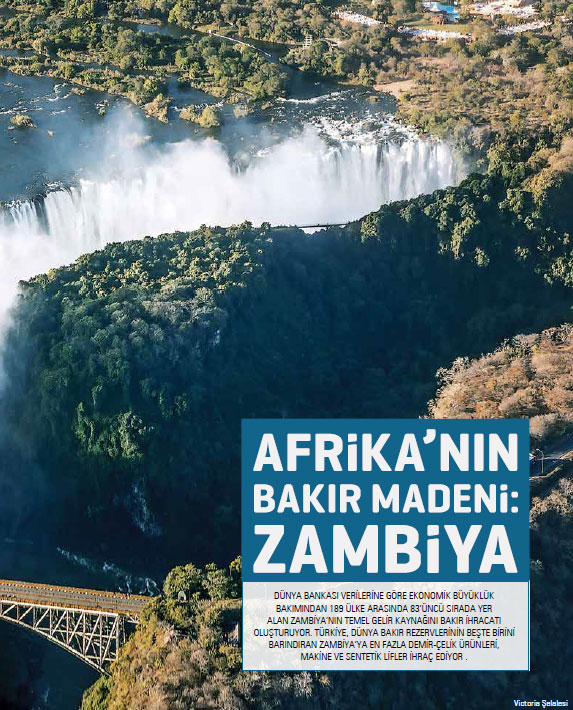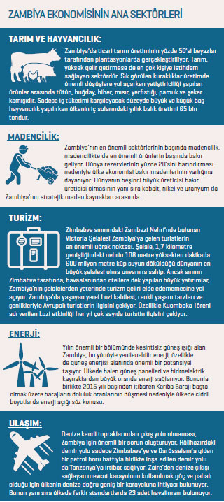 Dünya Bankası verilerine göre ekonomik büyüklük bakımından 189 ülke arasında 83’üncü sırada yer alan Zambiya’nın temel gelir kaynağını bakır ihracatı oluşturuyor. Dünya bakır rezervlerinin yüzde 20’sini barındıran Zambiya’ya Türkiye’nin ihracatında ilk sırayı demir-çelik ürünleri, makine ve sentetik lifler oluşturuyor.