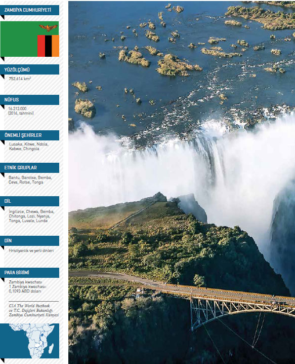 752 bin 614 kilometrekarelik yüzölçümüyle neredeyse Türkiye kadar büyük bir ülke olan Zambiya’da ortalama yaşam süresi 38 yıl olarak ölçülüyor. 16 milyonluk nüfusunun yaklaşık 1 milyonu ise AIDS’le mücadele ediyor. 1960 yılına kadar Kuzey Rodezya ismini taşıyan ülke şimdiki adını, topraklarında doğan ve Zimbabve ile sınırı oluşturan Zambezi Nehri’nden alıyor. Zambezi aynı zamanda Nil, Kongo ve Nijer Nehirleri’nden sonra Afrika’nın dördüncü büyük nehri. Yerel dilde “Gürleyen Duman” anlamına gelen Mosi-oa-Tunya Şelalesi’ne 1855 yılında bölgeyi ziyaret eden İskoç David Livingstone tarafından İngiltere Kraliçesi Victoria’nın adını verildi.