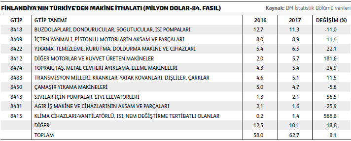 BM İstatistik Bölümü verilerine göre Finlandiya’nın 84. fasıl kapsamında Türkiye’den gerçekleştirdiği makine ithalatı, 2017 yılında 62,7 milyon dolar olarak kaydedildi. 2016 yılında bu rakam 58 milyon dolar seviyesindeydi. Böylelikle Finlandiya’nın Türkiye’den gerçekleştirdiği makine ithalatı yüzde 8,1 artmış oldu.