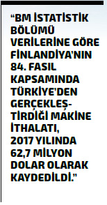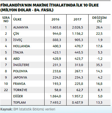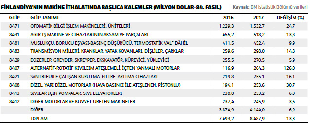 BM İstatistik Bölümü verilerine göre Finlandiya’nın makine ihracatı 2016’ya göre yüzde 11,6 artışla 8,5 milyar dolar olarak kayda geçti. Finlandiya 2017 yılında 900,2 milyon dolarla en fazla Rusya’ya makine ihraç ederken, Rusya’ya gerçekleşen ihracattaki artış yüzde 23,2 olarak gerçekleşti. Finlandiya’nın 2017 yılında en fazla makine ihraç ettiği ikinci ülke 764,9 milyon dolarla ABD olurken, ABD’ye yönelik ihracat yüzde 13,9 artış gösterdi. Üçüncü sırada bulunan Çin’e 2016 yılında 612,1 milyon dolarlık makine ihraç edilirken, 2017 yılında bu rakam yüzde 7,4 artarak 657,1 milyon dolar oldu. Türkiye, Finlandiya’nın 2017 yılında 134,9 milyon dolarla en fazla makine ihraç ettiği 16’ncı ülke oldu. Finlandiya 2016 yılında Türkiye’ye 134 milyon dolar değerinde makine göndermişti. Böylece 2017 yılında Türkiye’nin ithalatı bir önceki yıla göre yüzde 0,7 artmış oldu.